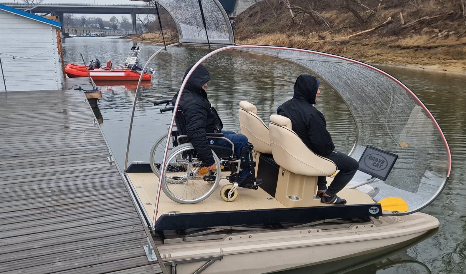 BRAVECAT with a lifting deck or with a folding gangway provides comfortable and safe boarding and leaving the vessel. Specially designed rails on the deck are used to safely attach wheelchairs or scooters of people with disabilities. Seats for the rest of the crew are also attached to the rails.